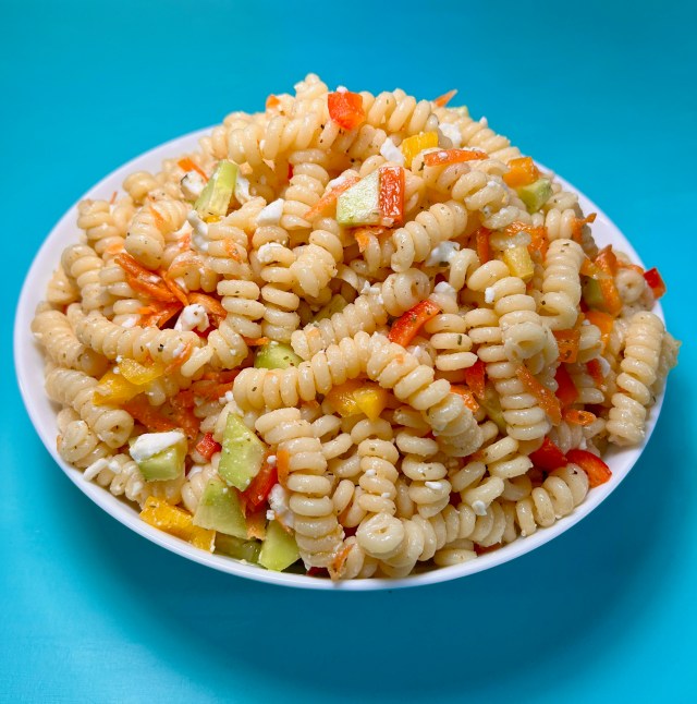 - Place pasta and vegetables in a large bowl. Drizzle the oil and seasoning on top. Mix to combine everything evenly, then add the feta and mix one more time.